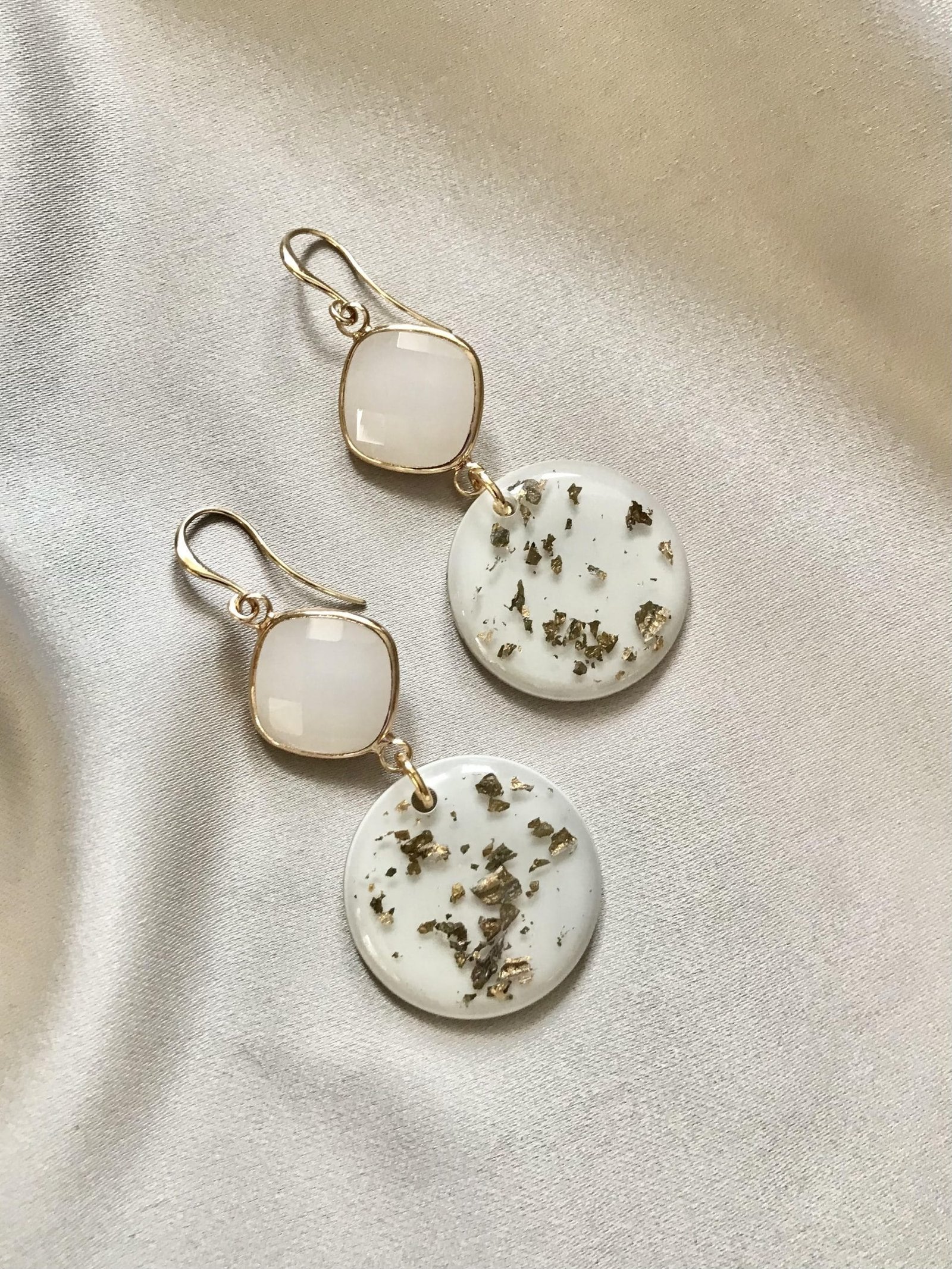 Vergulde oorhaakjes met witte jade en leuke witte resin hangers met subtiele goudvlokjes!