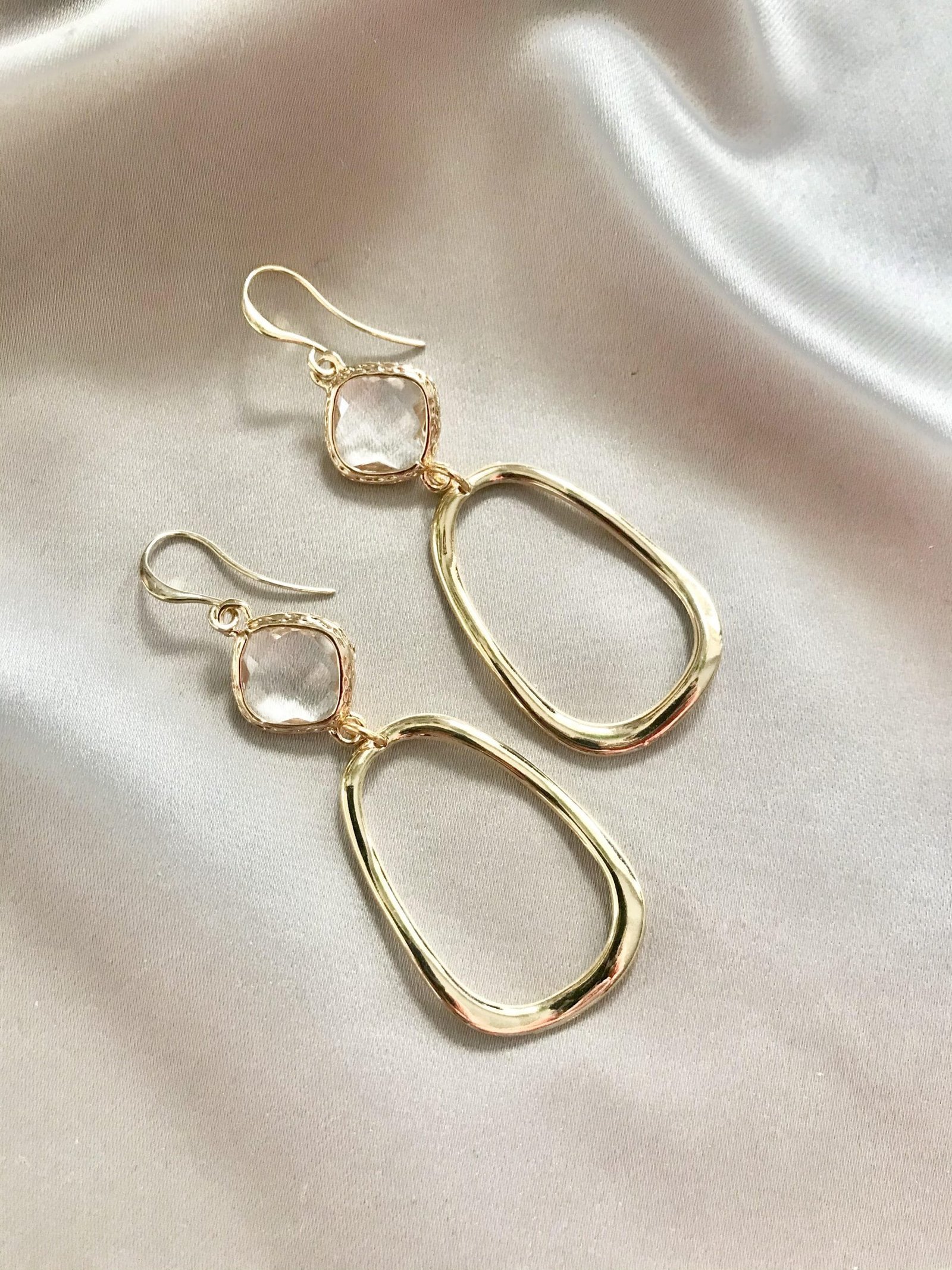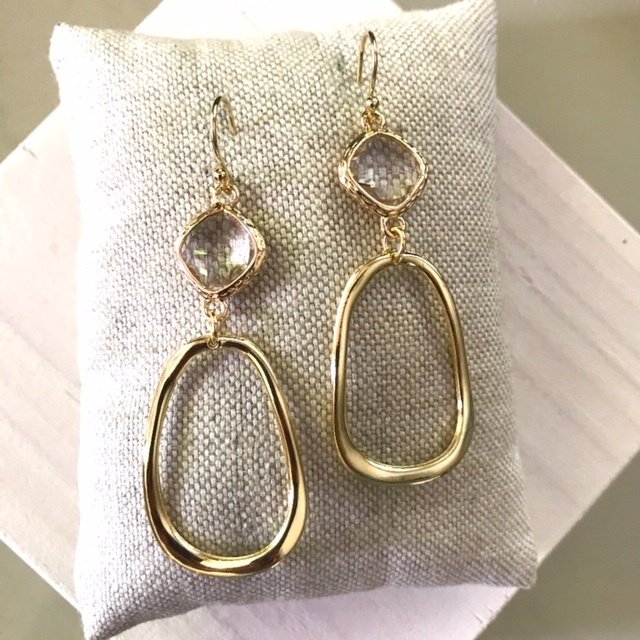 Vergulde oorhaakjes met clear white glasstenen en gladde messing hangers die mooi van kleur blijven. De set draagt heerlijk licht!