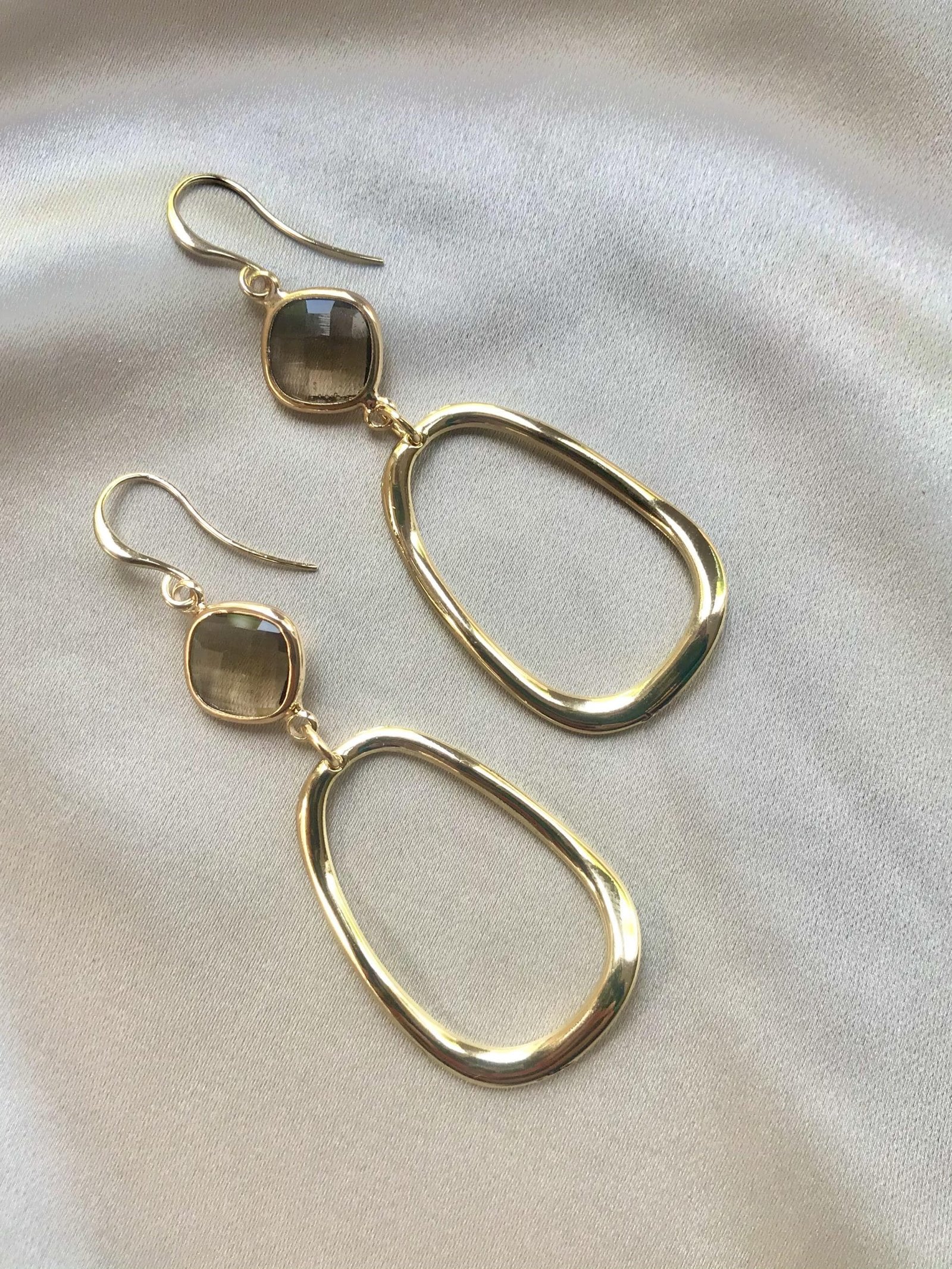 Vergulde oorhaakjes met vergulde bruine glassteentjes en goudkleurige gladde open hangers.