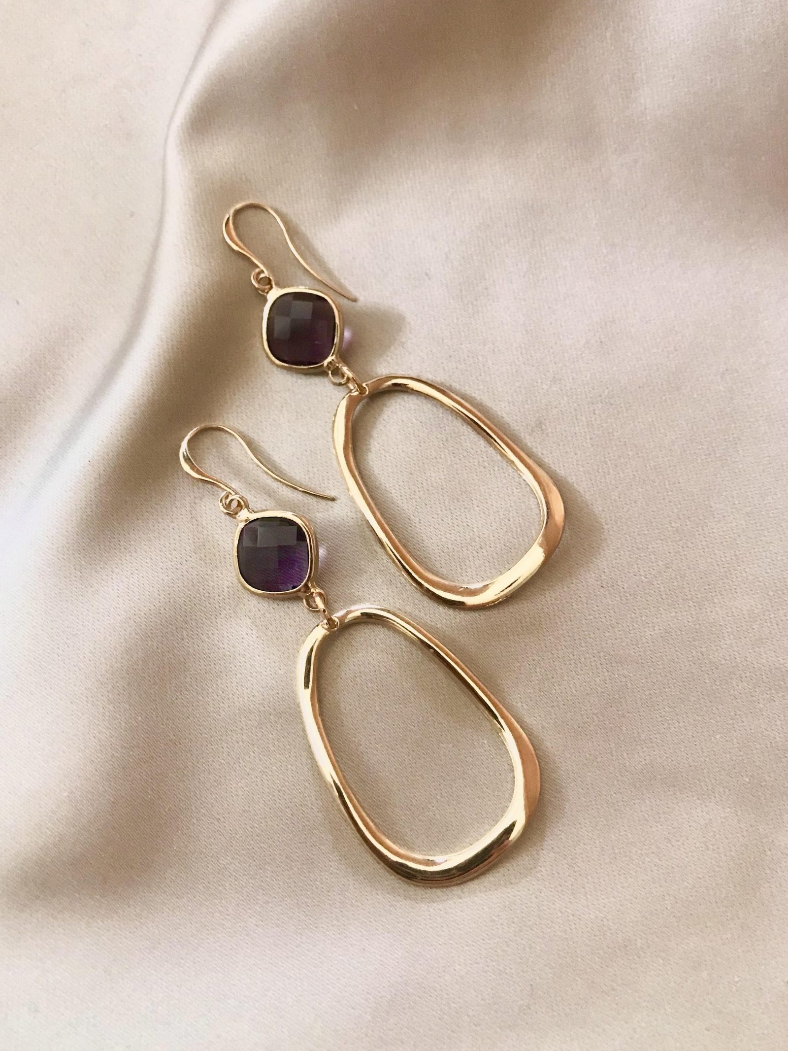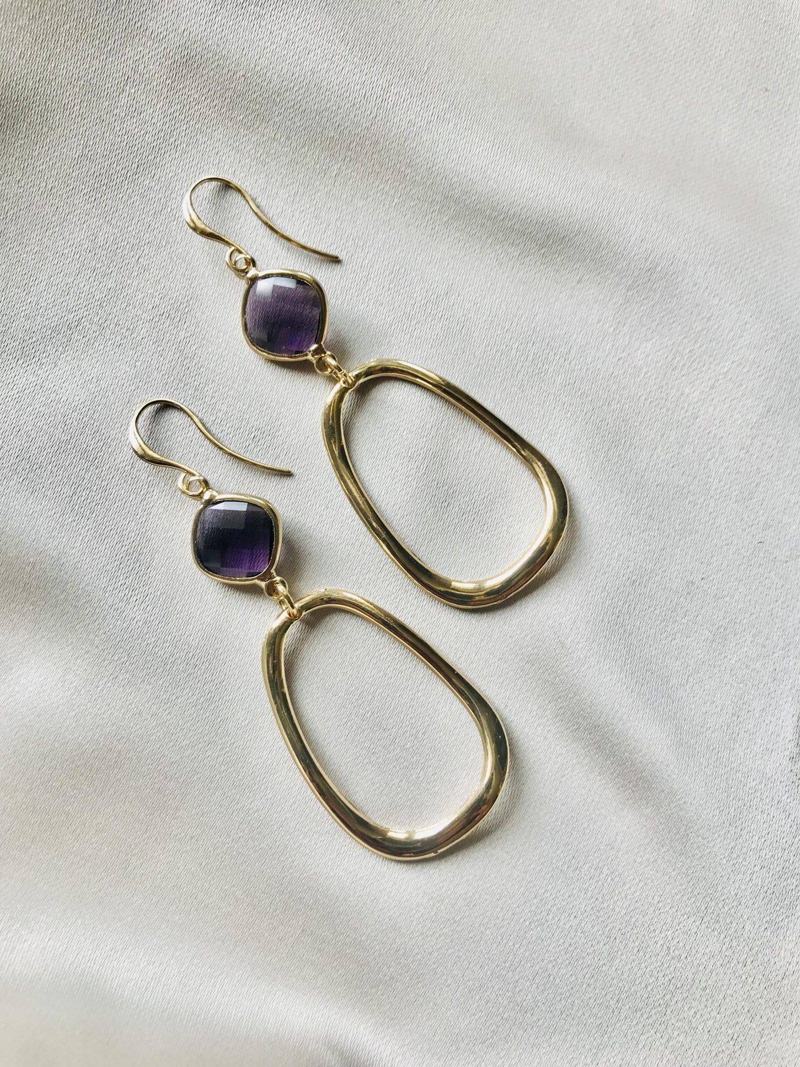Vergulde oorhaakjes met vergulde paarse glassteentjes en goudkleurige hangers. Deze set draagt heerlijk licht aan het oor.