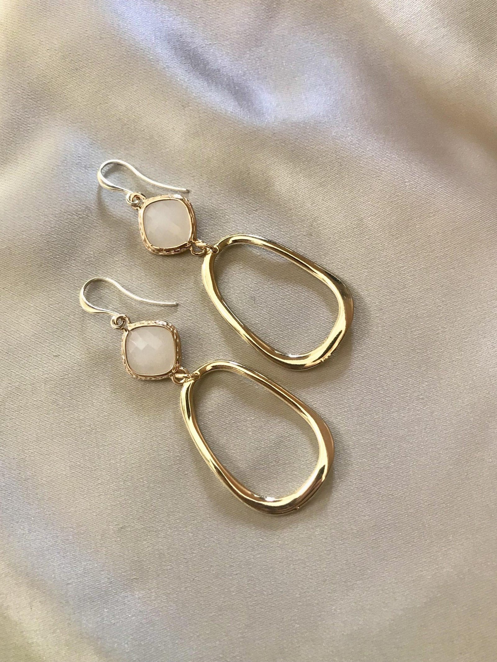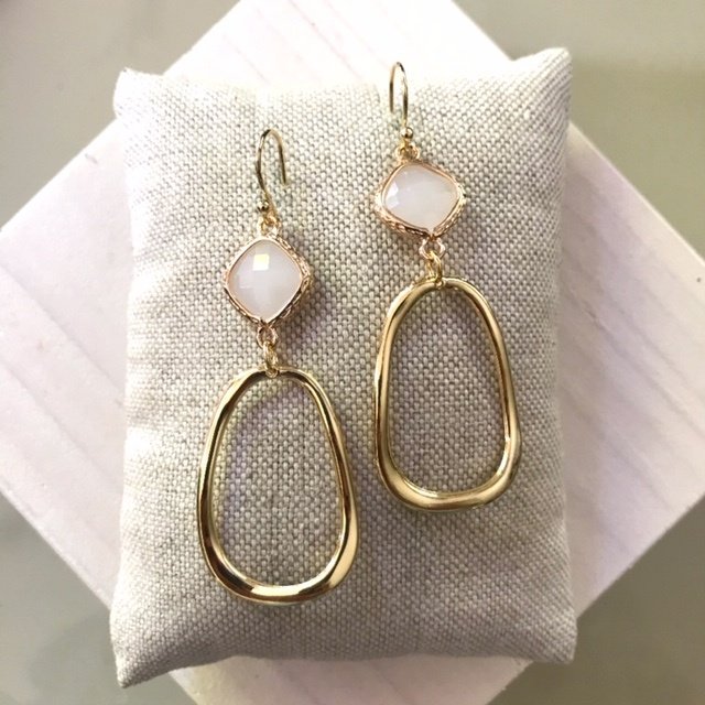Vergulde oorhaakjes met poederwitte jade en gladde messing hangers die mooi van kleur blijven. De set draagt heerlijk licht!