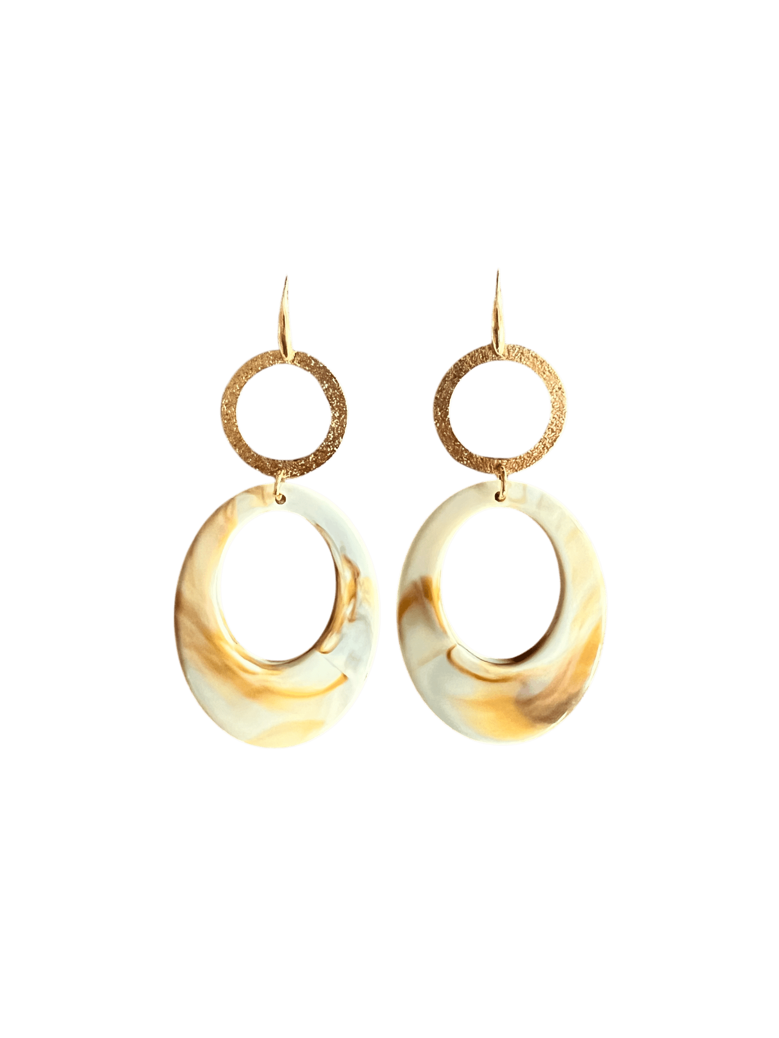 Vergulde oorhaakjes met goudkleurige brushed ringen en roomwitte/caramel resin hangers. Elke hanger is weer anders qua print. Leuke statement oorbellen die zich goed laten combineren en heerlijk licht dragen!