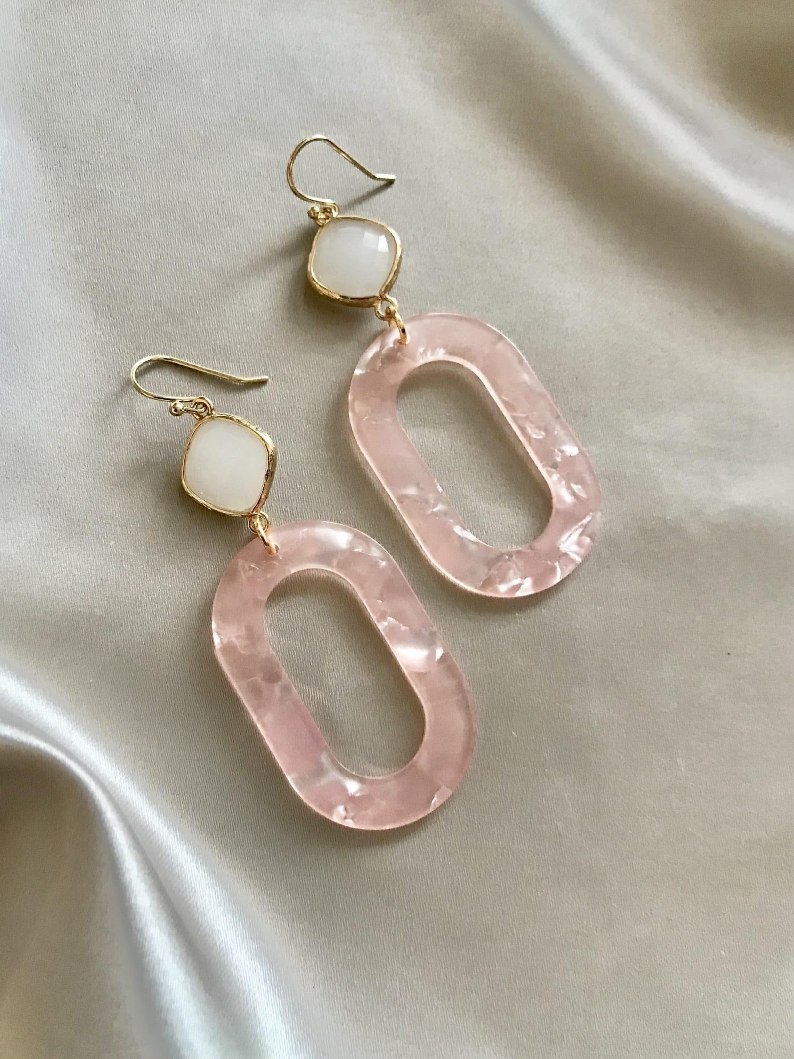 Vergulde oorhaakjes met Poederwitte Jade met lichtgewicht roze resin open hangers. De hangers zijn een beetje gemêleerd, ze spelen als het ware met het licht!