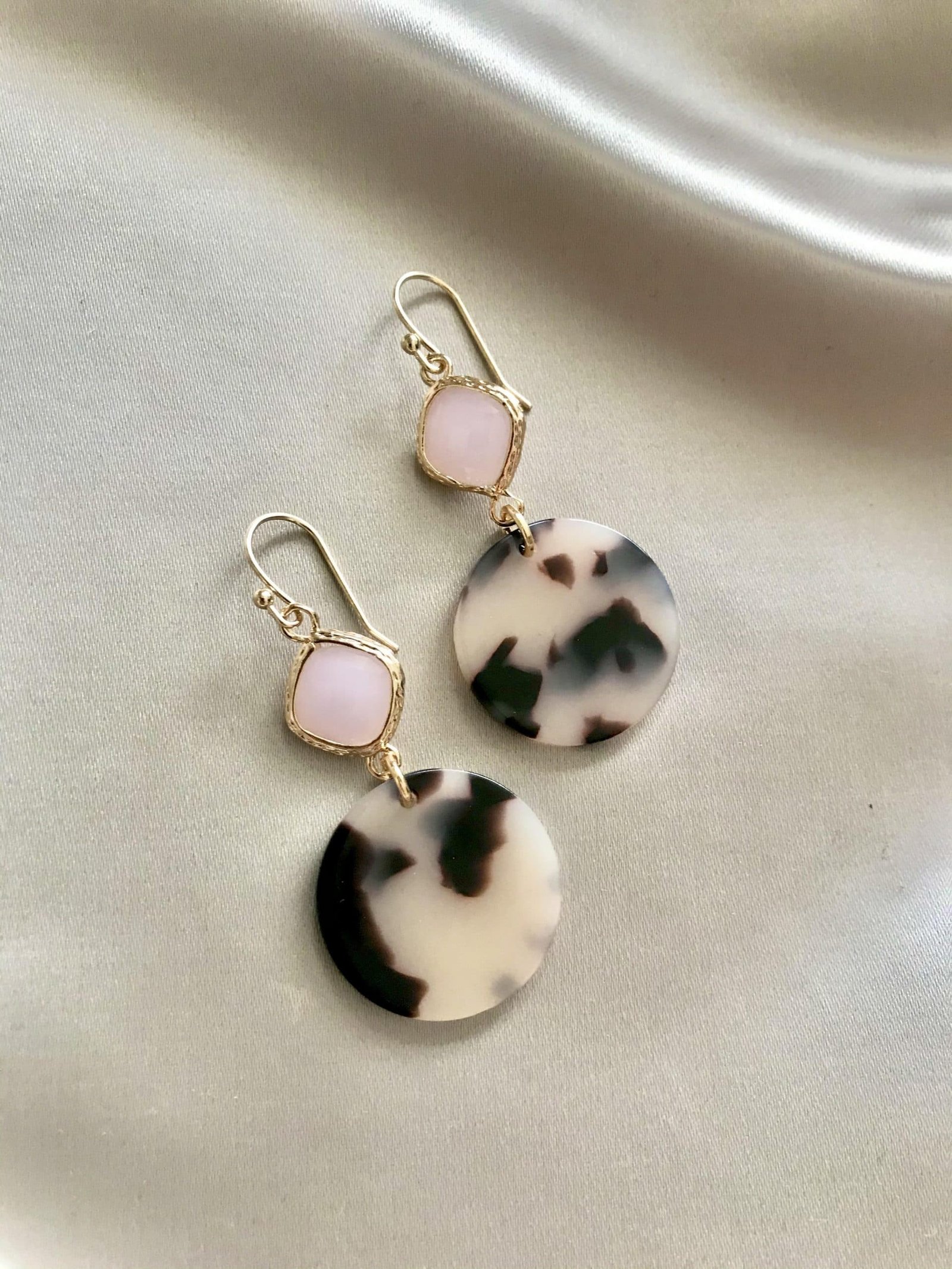 Roze jade steentjes gecombineerd met leuke ronde dierenprint resin hangers. Dit model is wat kleiner, en zeer geschikt voor dames die niet van te grote / kolossale oorbellen houden.