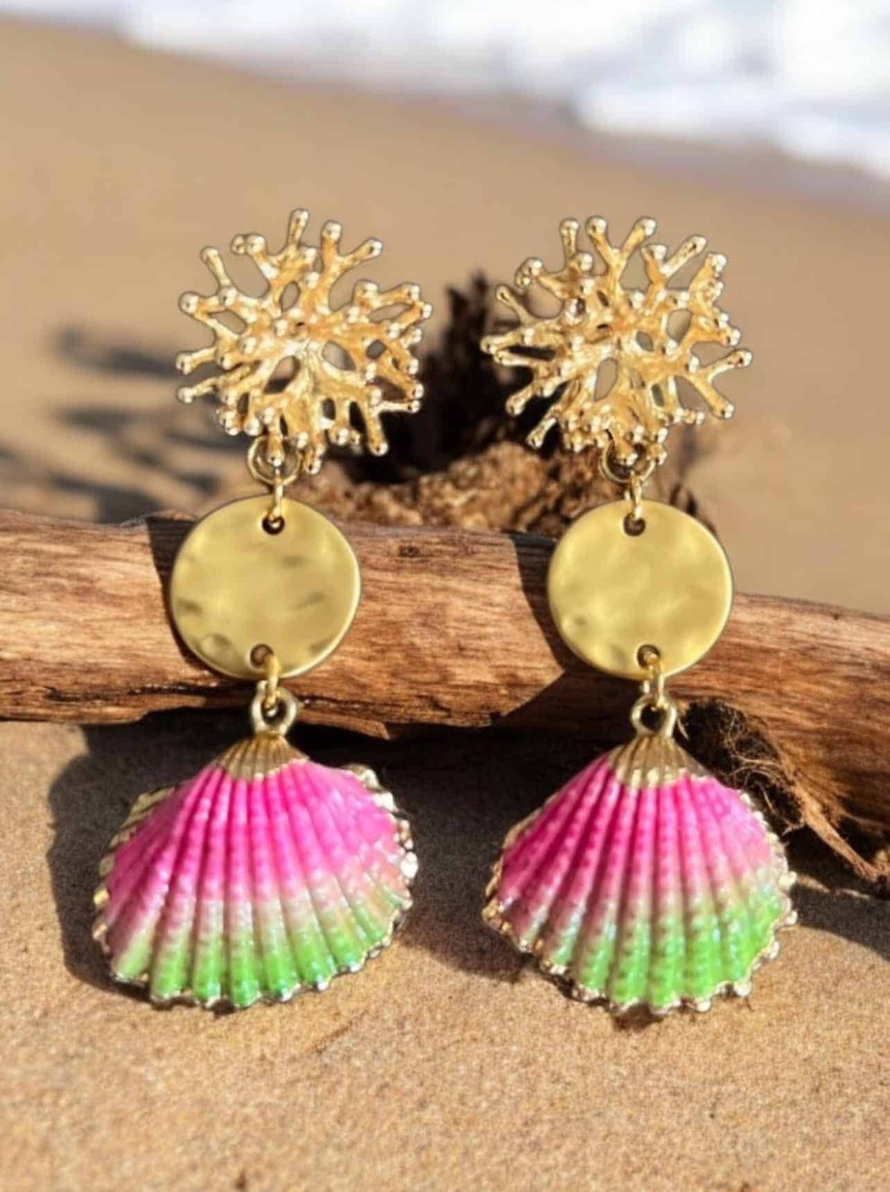 Ready to shine in full color met deze kleurrijke schelpen in het roze/appeltjesgroen. De koraalvormige oorstekers zijn goldplated evenals de muntjes. Deze set is licht van gewicht maar groots in uitstraling. Perfect voor zonnige dagen en zwoele avonden.