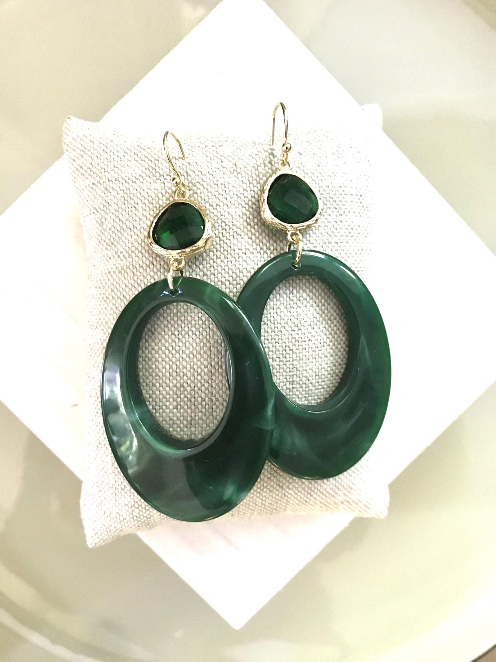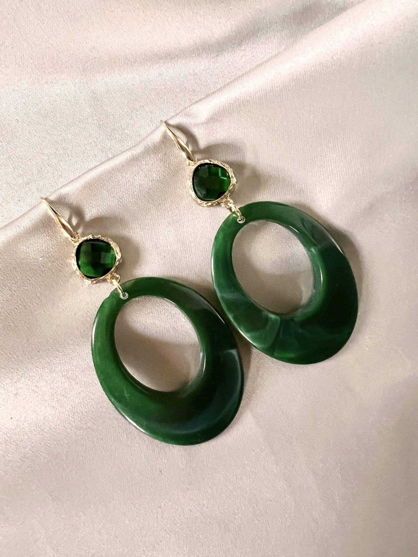 Goldplated smaragdgroene facetgeslepen glassteentjes met groene resin hangers, die licht gemêleerd zijn.  De oorhaakjes zijn goldplated. Mooie statement oorbellen die heerlijk licht aan het oor dragen.