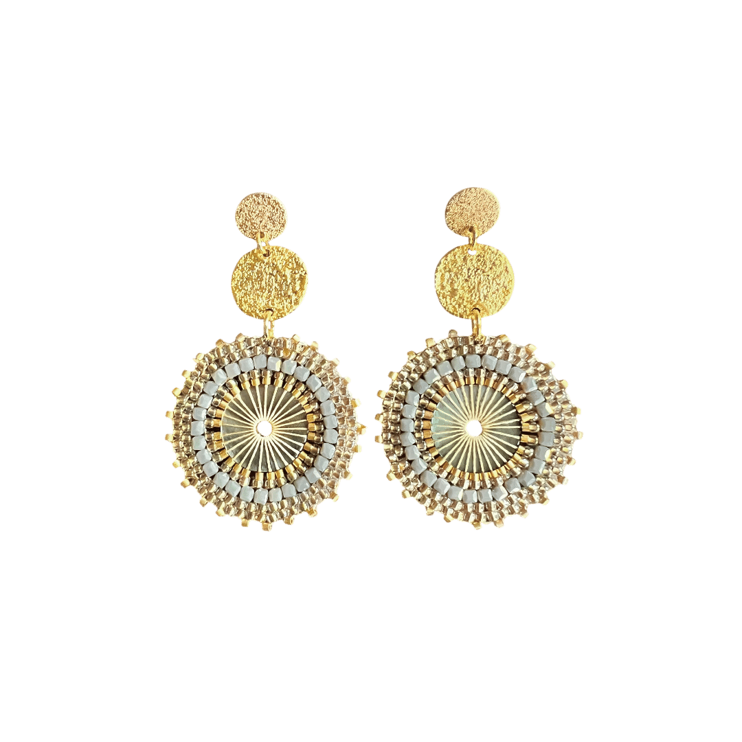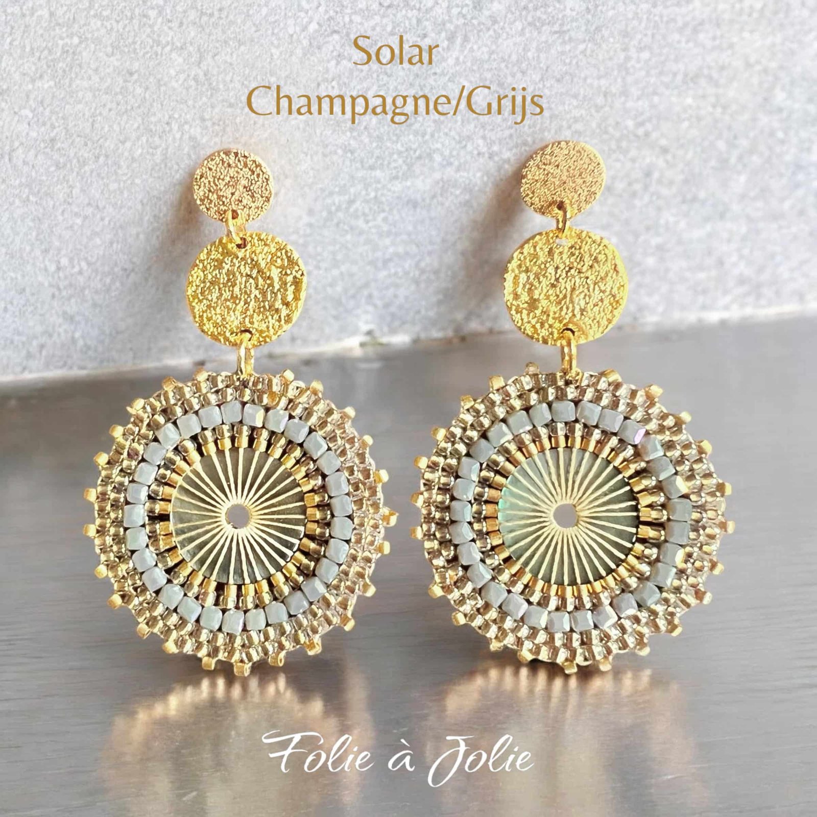 Oh wat zijn dit mooie solars van Folie à Jolie! De hangers zijn champagne kleurig met een beetje grijsblauw er in. En ze pakken zo mooi het licht op waardoor ze subtiel glanzen. Gecombineerd met goldplated muntjes en goldplated oorstekers die heel goed op het oor blijven zitten. Deze set draagt superlicht aan het oor!