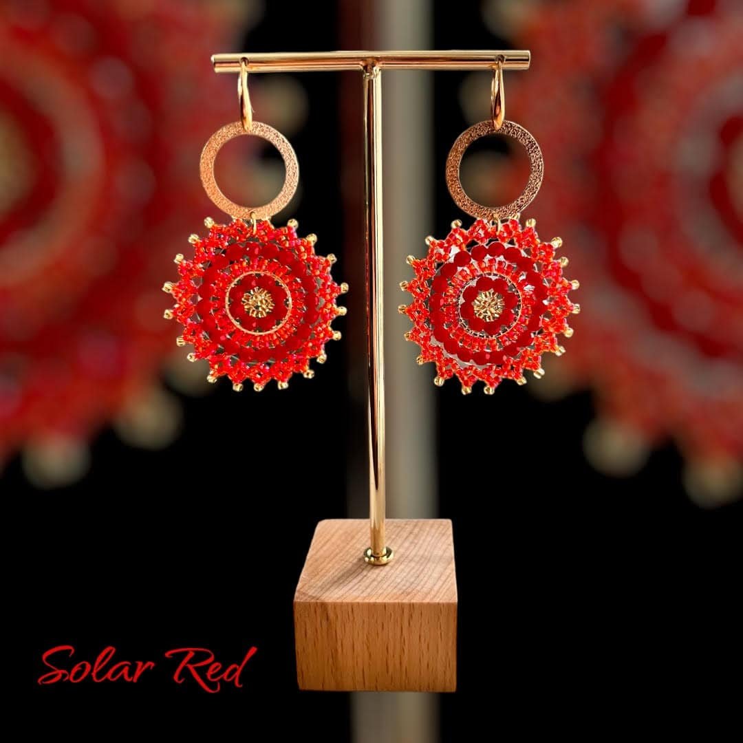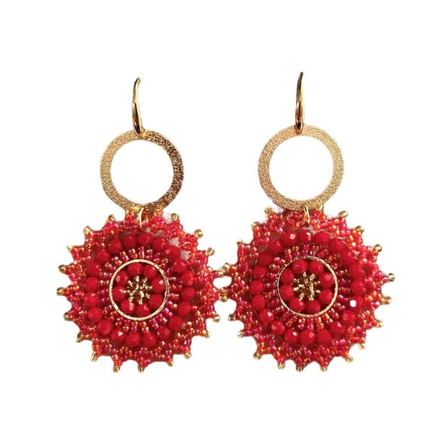 De leuke Solar oorbellen van Folie à Jolie zijn nu ook verkrijgbaar in het rood! Met vergulde oorhaakjes en messing open ringen.