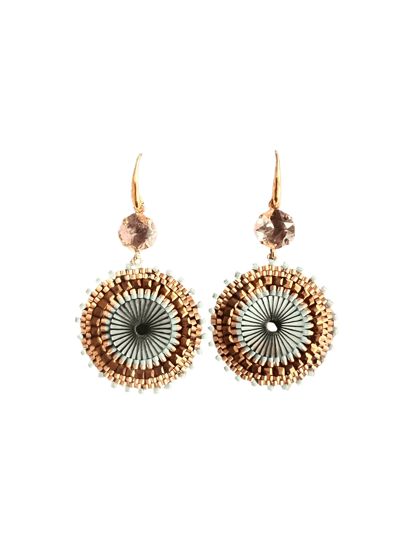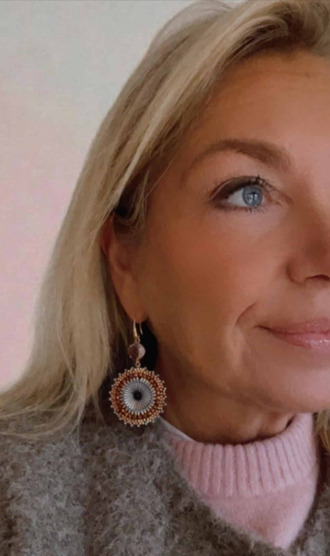 Wederom zo’n mooie solar set, in een mix van vintage pink en ijsblauw met roze glassteentjes. De oorhaakjes zijn verguld, irriteren niet aan het oor en blijven mooi van kleur.