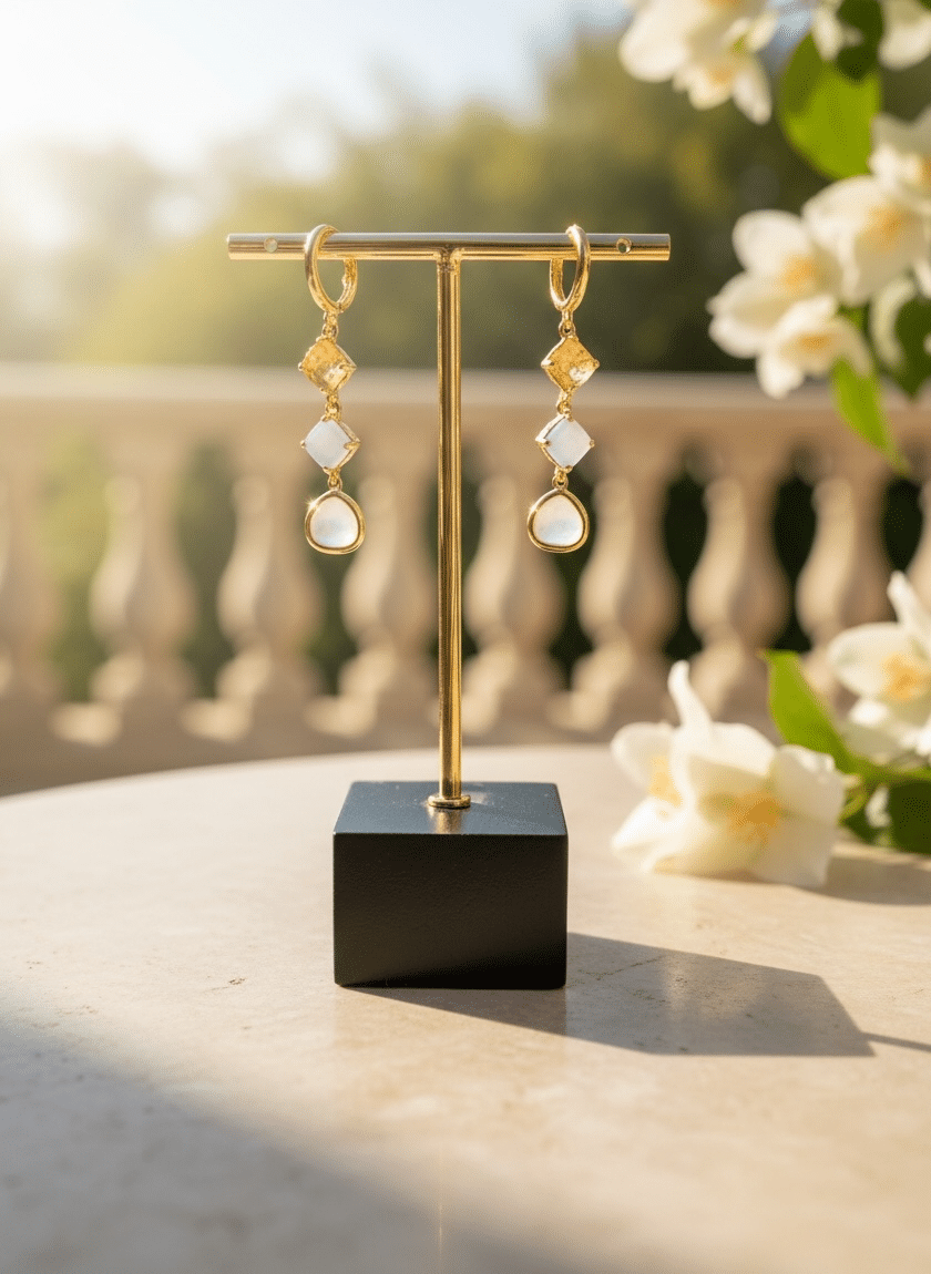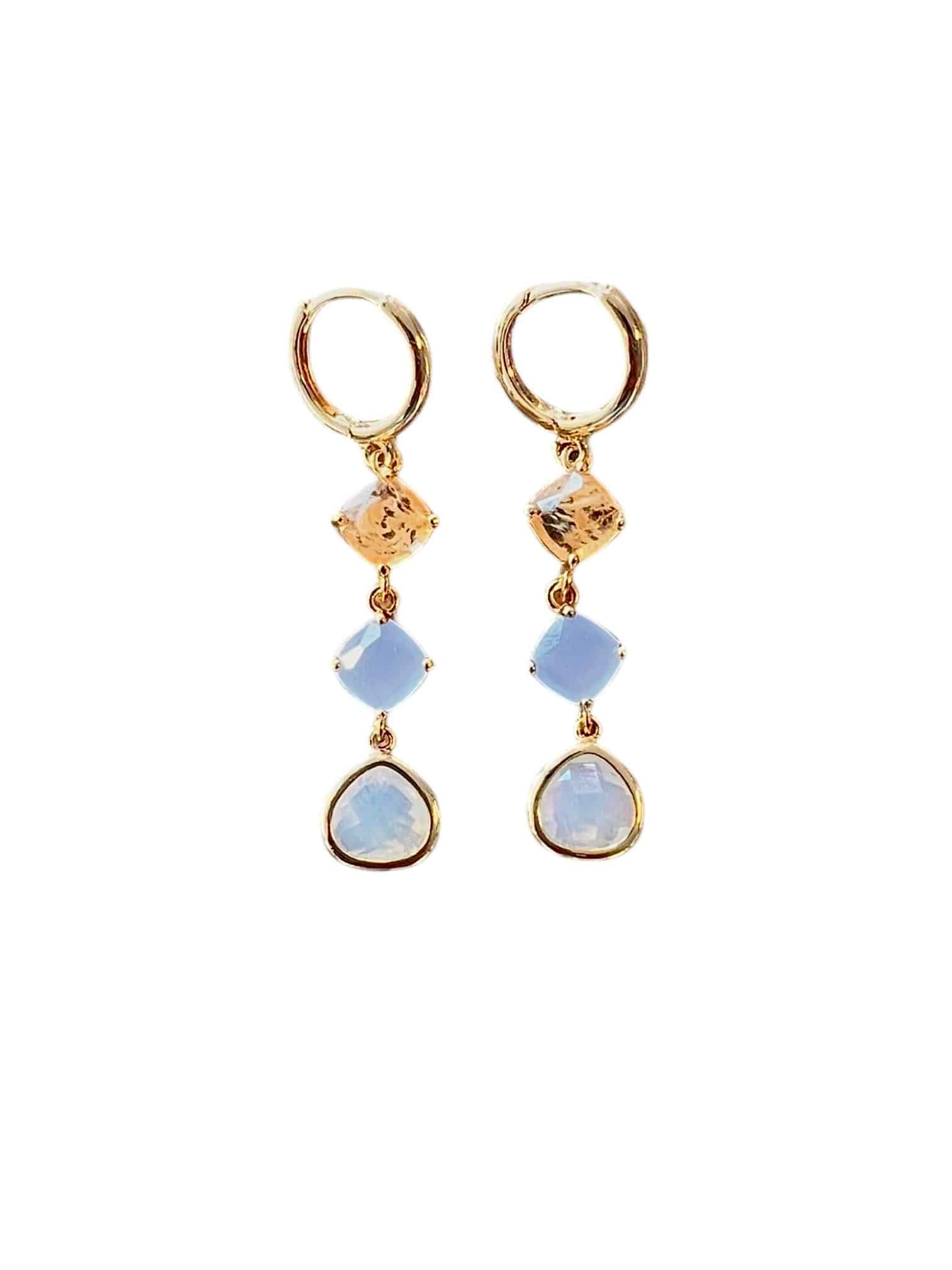 Maak je look af met deze schatjes! Goldplated oorringetjes met goldplated beige en ijsblauwe steentjes en troebelwitte drops. Een elegante, delicate set die heerlijk licht draagt!