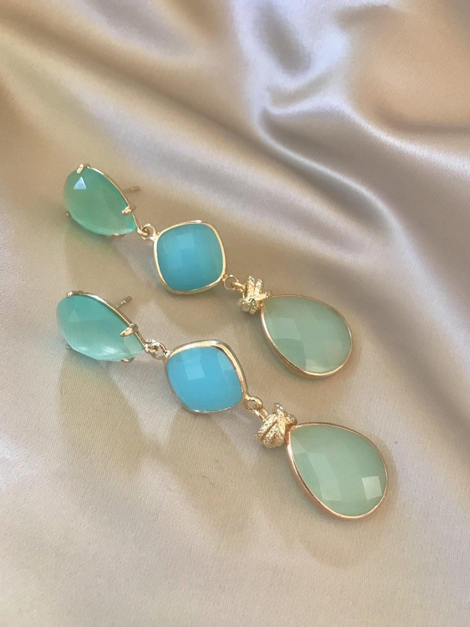 Exclusieve handgemaakte oorbellen van Folie à Jolie! Mintkleurige catseye oorstekers met aquablue jade en mintkleurige drops, afgewerkt met goldplated twisted ringetjes.