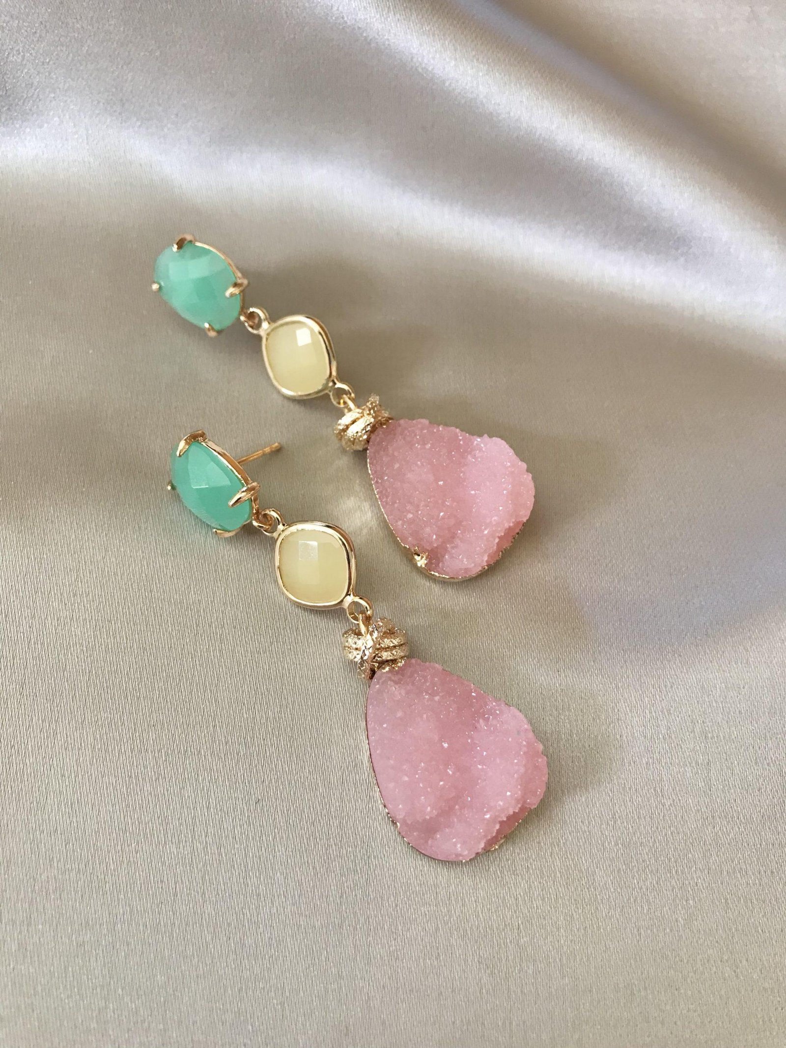 Deze kleuren doen ons denken aan een heerlijk sorbetijsje! Mintgroene oorstekers met gele jade en roze druzy stone drops, afgewerkt met goldplated ringetjes. Ze dragen licht aan het oor.