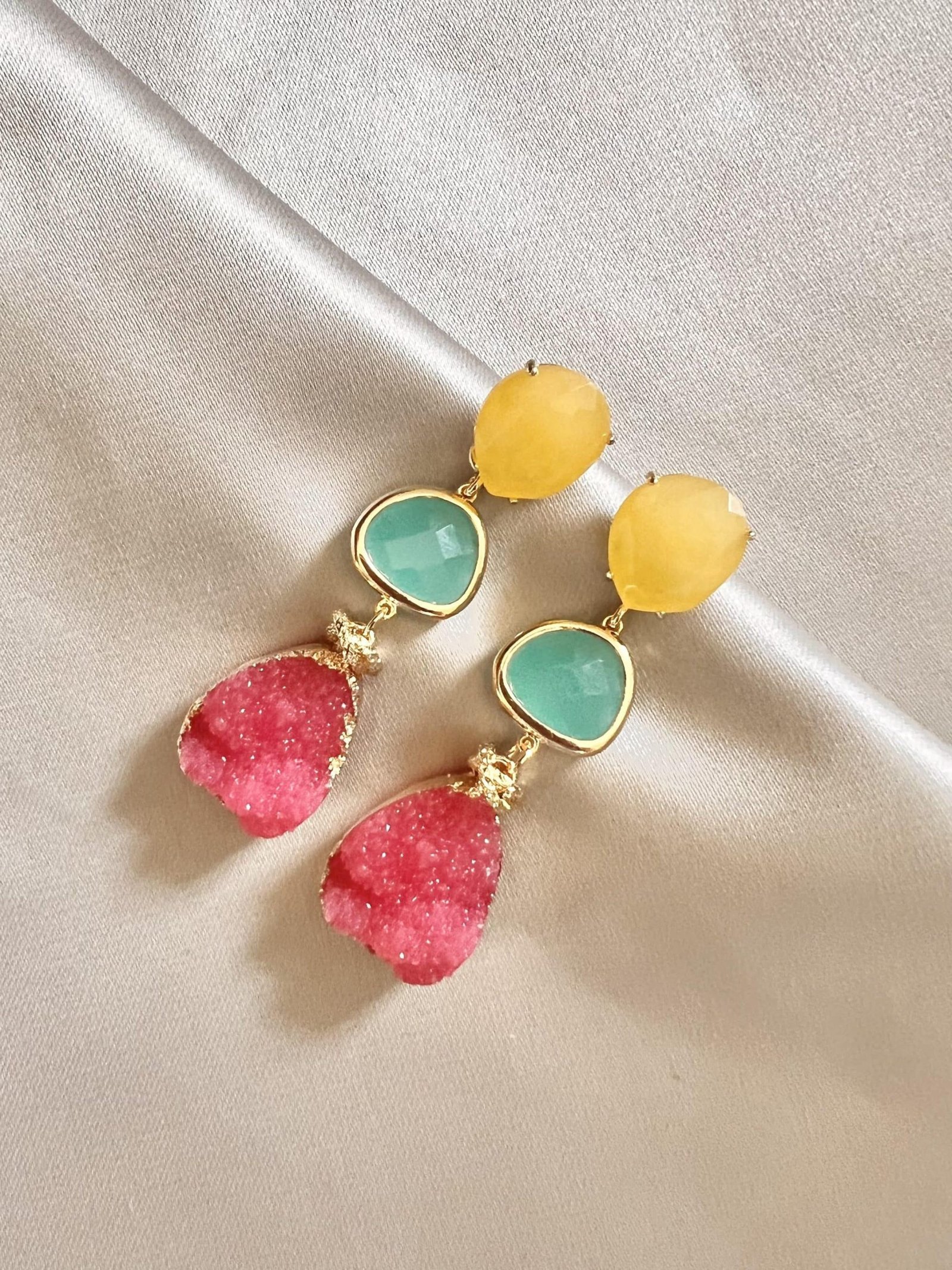Laat de zon maar schijnen met deze te leuke set van Folie à Jolie! Goldplated gele oorstekers met aqua chalcedoon en fuchsia druzy drops, afgewerkt met goldplated materialen. Deze set draagt heerlijk licht aan het oor.