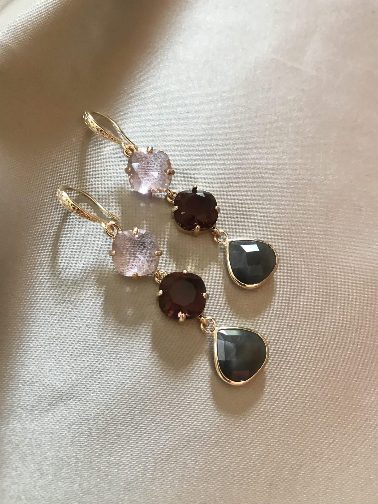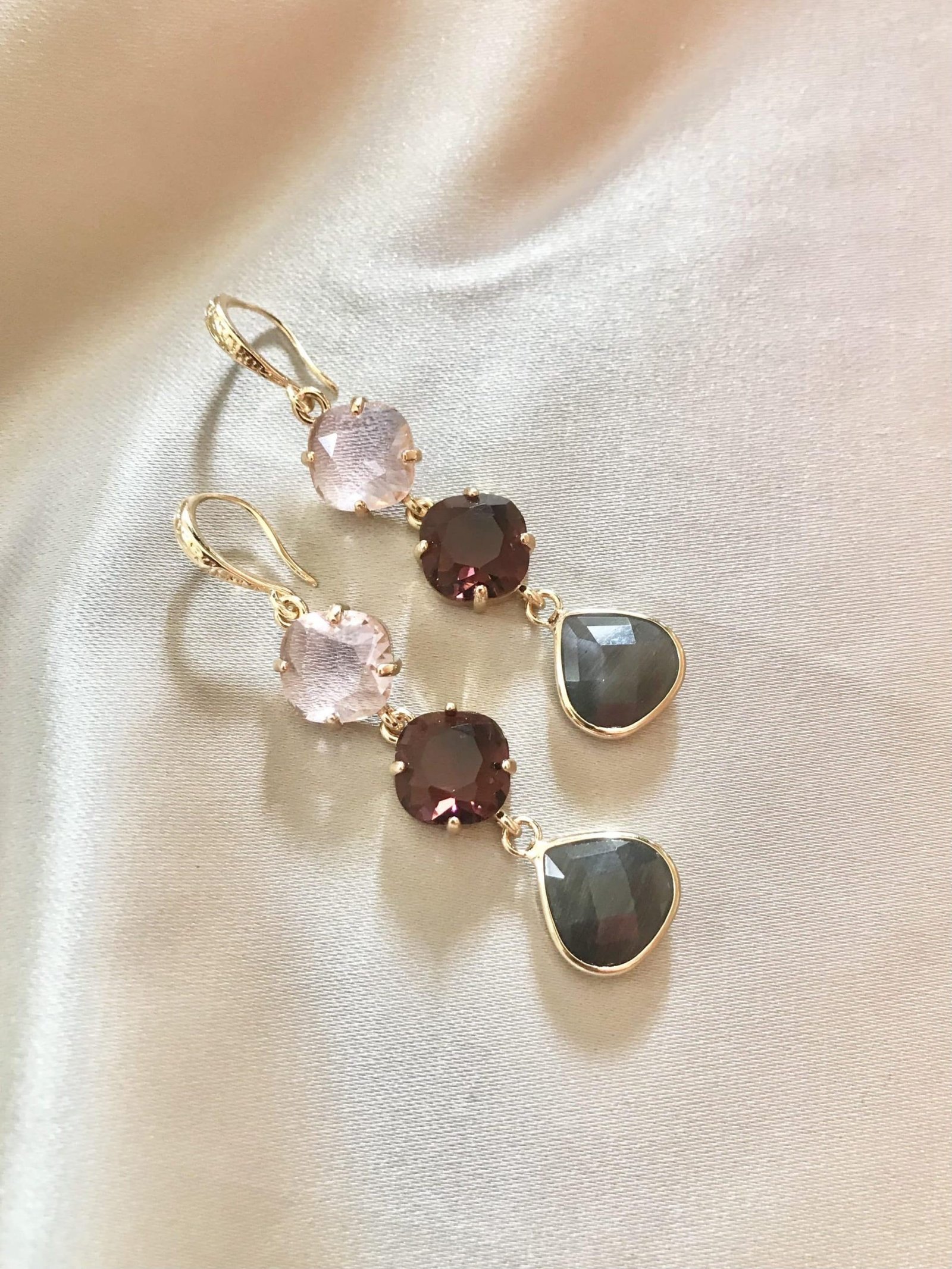 Goldplated oorhaakjes met roze en burgundy glassteentjes, gecombineerd met grijze catseye.
