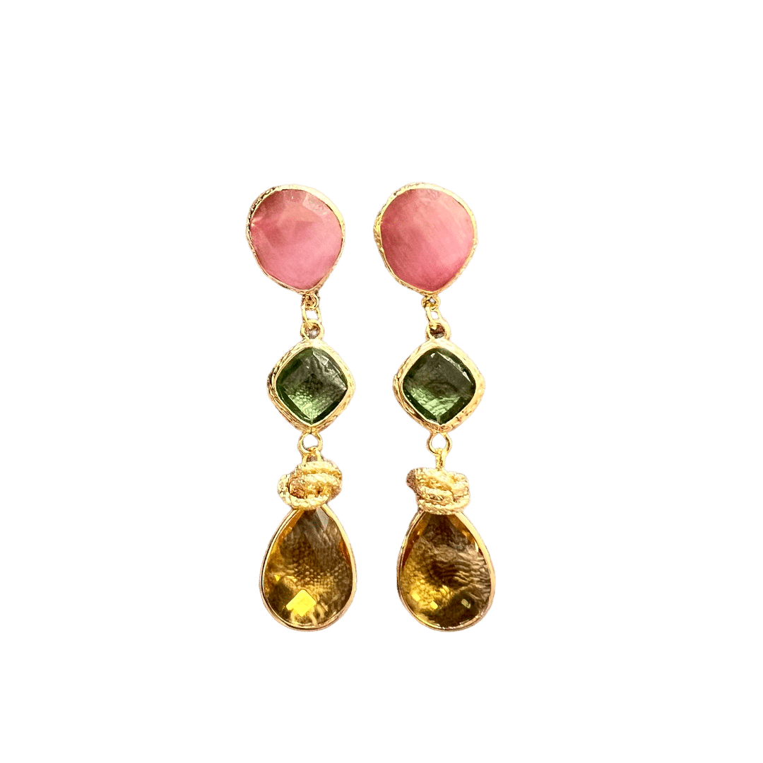 Meer Spring Colours van Folie à Jolie! Deze set bestaat uit mooie kwaliteit goldplated roze catseye oorstekers, gecombineerd met goldplated appeltjes groene en gele factegeslepen glasstenen, afgewerkt met goldplated twisted ringetjes.