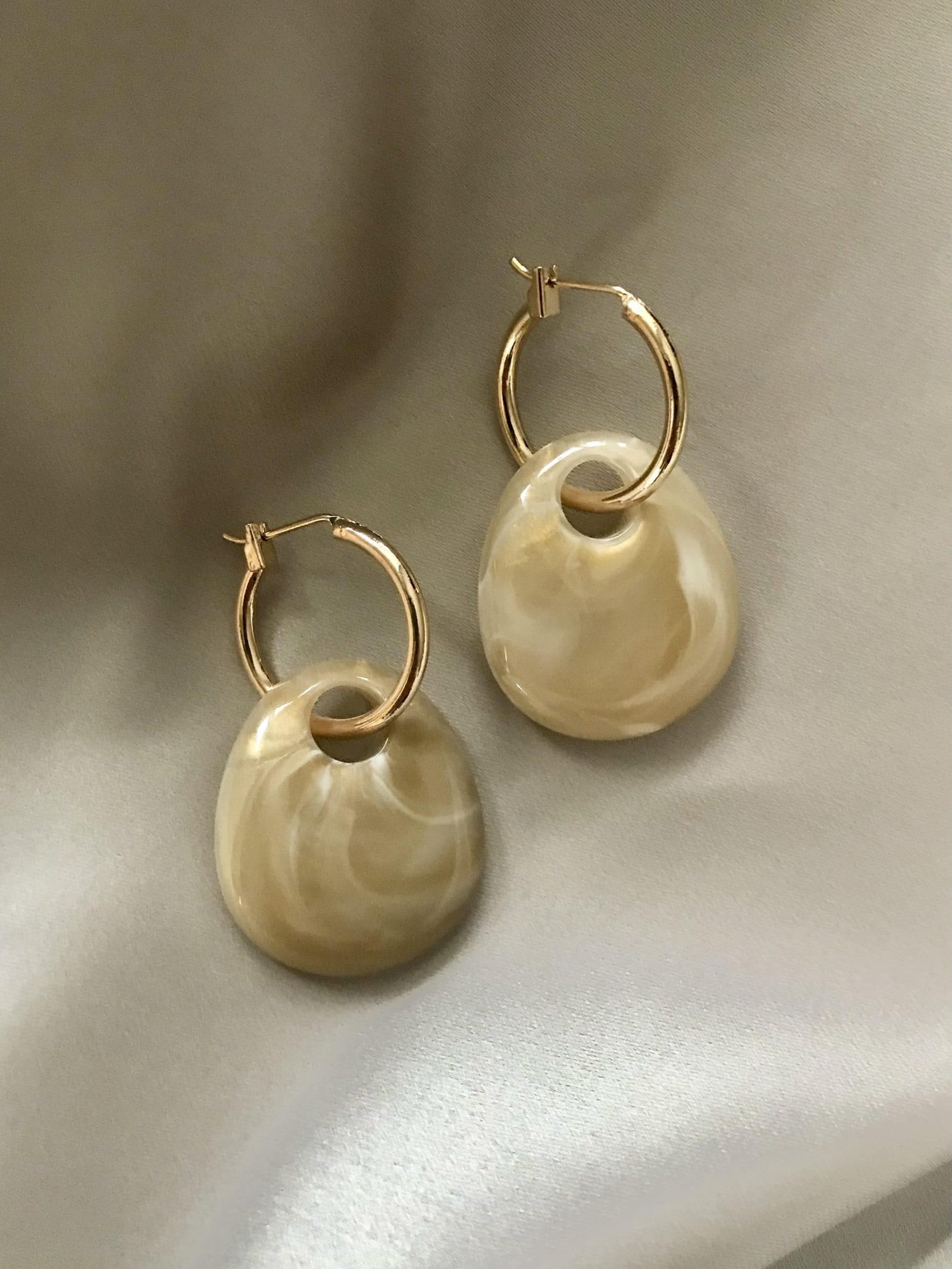 Vergulde oorringen (doorsnede 2 cm) met leuke, licht gemêleerde Goudbeige resin hangers. Ze dragen heerlijk licht aan het oor!