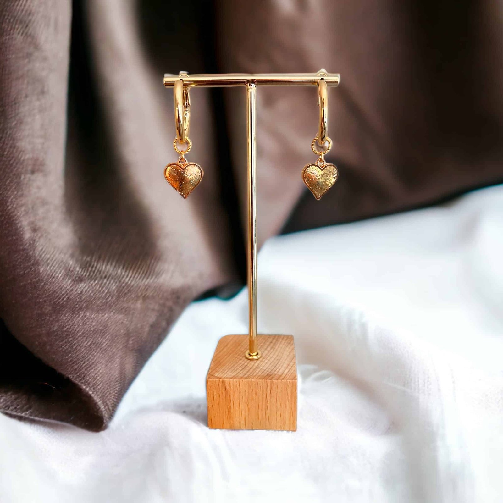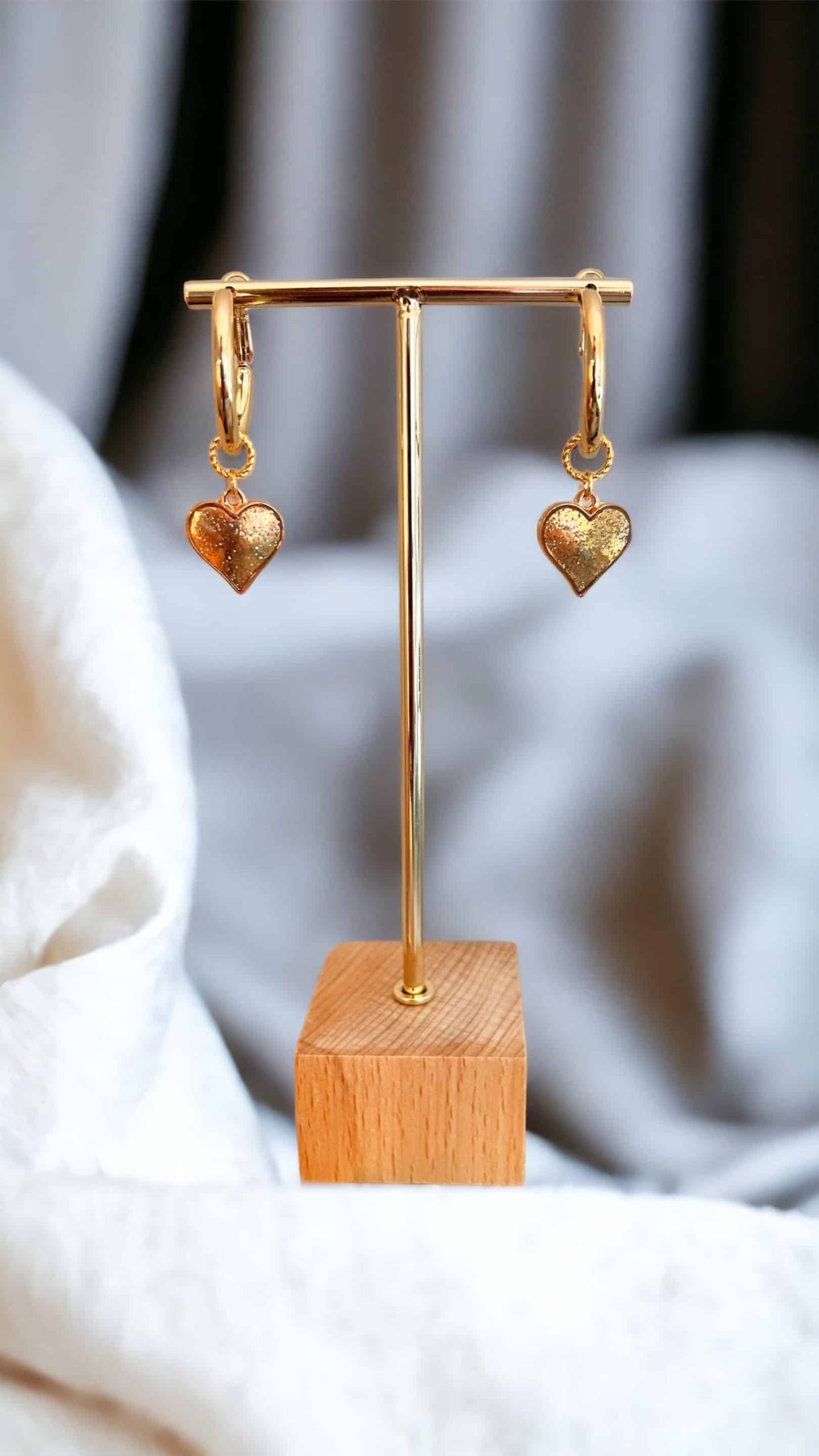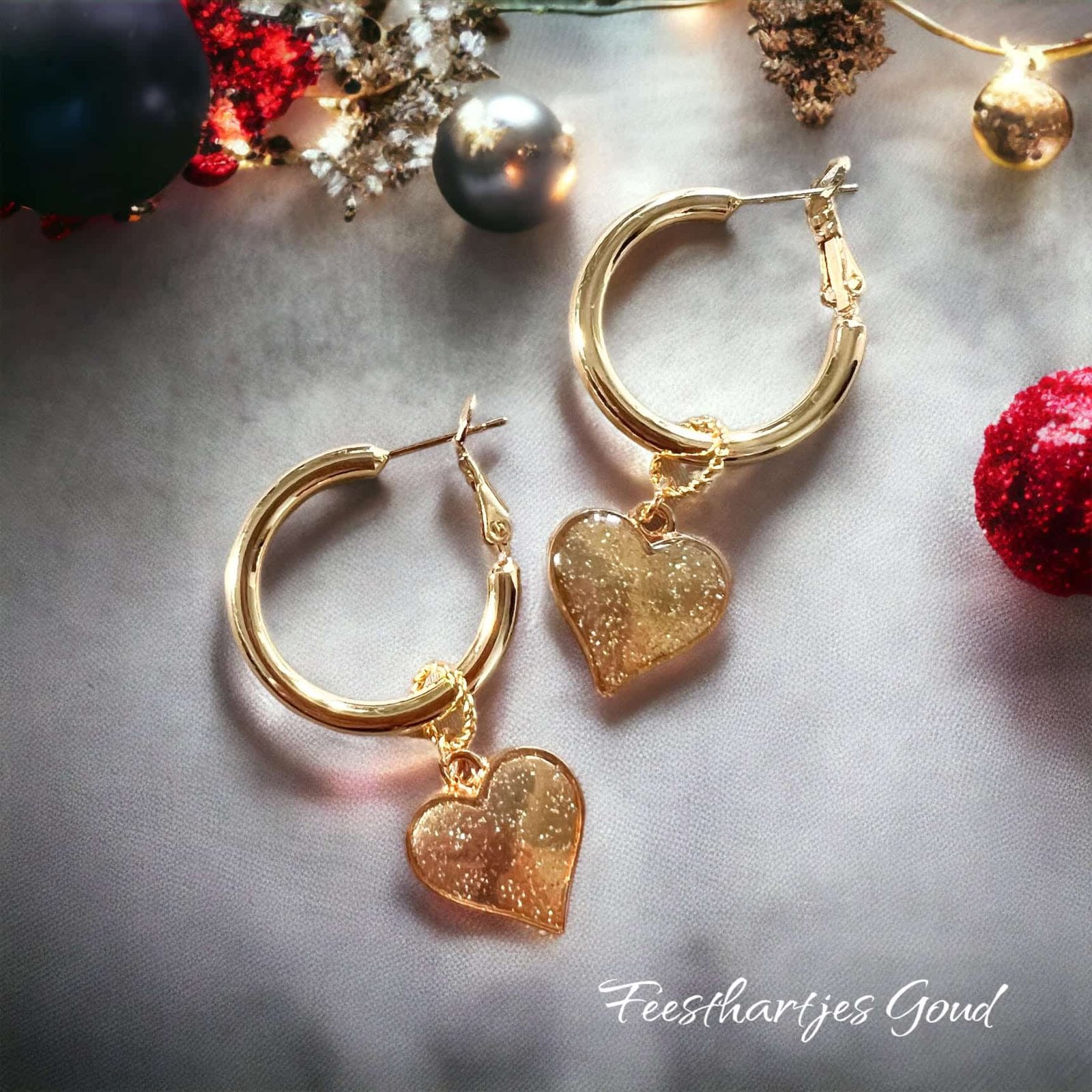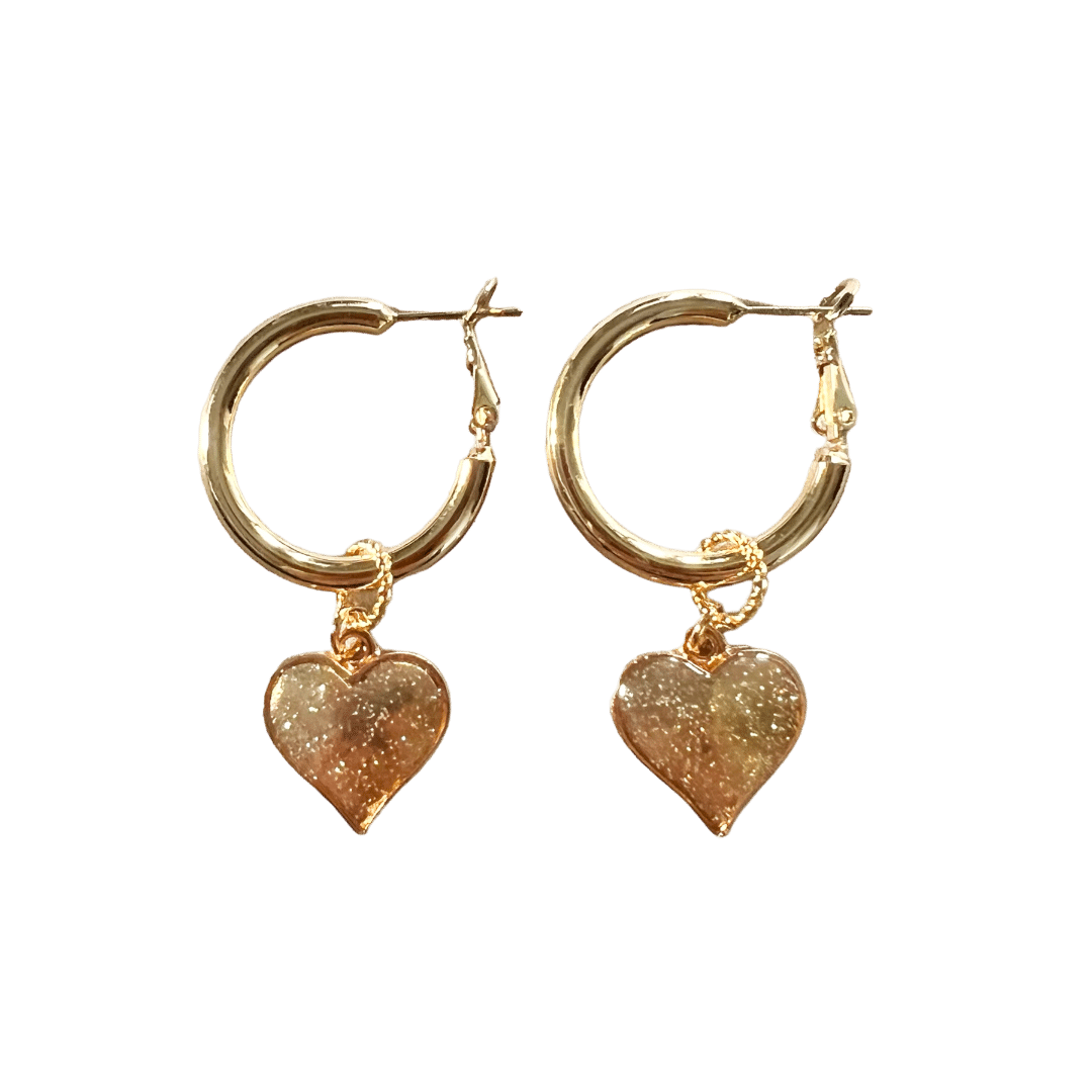 Prachtige kwaliteit oorringen, goud over zilver (doorsnede 2 cm) met goudkleurige hartjes met een glimmertje.