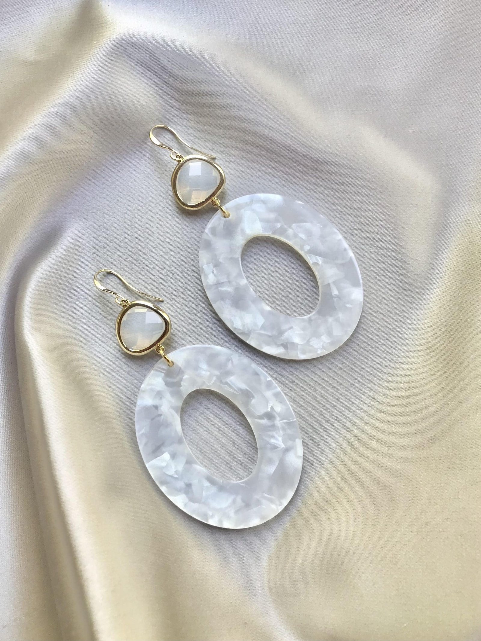 Vergulde oorhaakjes met opaliet glasstenen gecombineerd met witte, gemêleerde resin hangers.