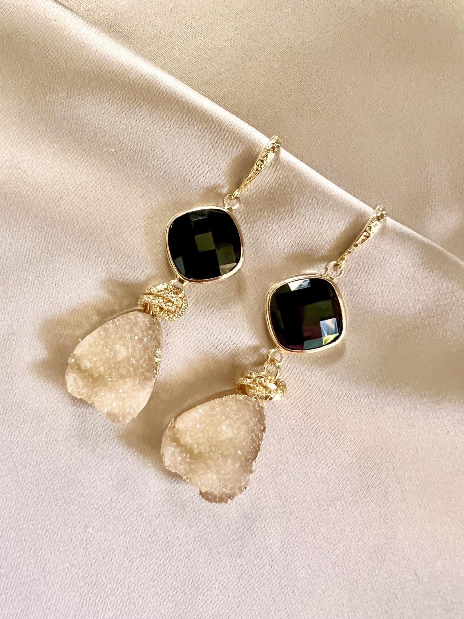 Mooie kwaliteit goldplated oorhaakjes met zwarte facetgeslepen glasstenen en beige druzy stone, afgewerkt met goldplated ringetjes. De set draagt heerlijk licht.